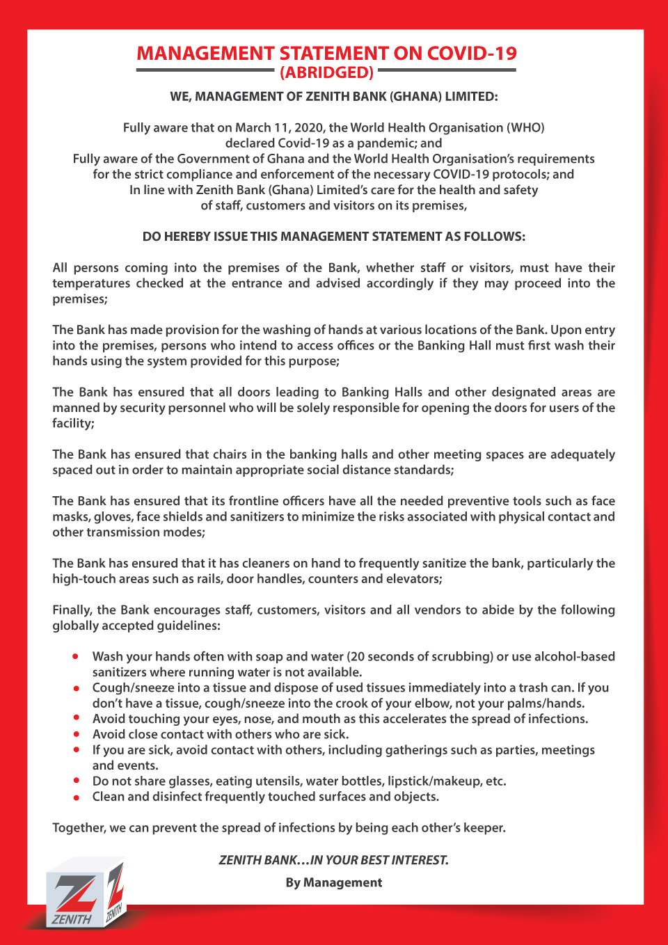 Management Statement on Covid-19